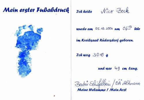 Hallo ich bin der Nico, ich wurde am 05.10.2004 um 06.13 Uhr im Krankenhaus Rüdersdorf geboren.